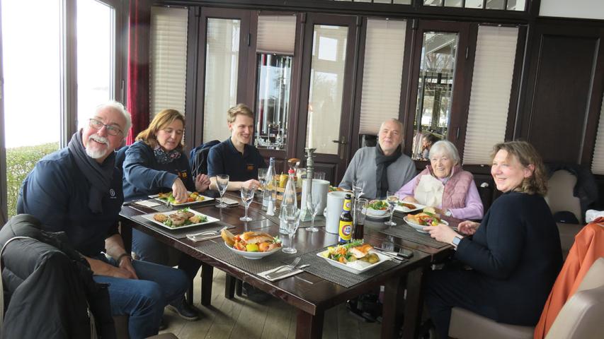 Als wir am Ufer der Kieler Förde ankamen, wartete auf uns schon eine freundliche Bedienung, und wir bekamen einen schönen Extraraum mit einem wunderschönen Blick aufs Wasser. Ein paar Frachter glitten übers Wasser, und es wurde schnell ein gemeinsames Gespräch gefunden. Frau S. hat vier Kinder großgezogen und lebte noch bis zum letzten Jahr zusammen mit einem von den Kindern zu Hause und wurde köstlich bekocht. Das ging nach ihrer schweren Erkrankung leider nicht mehr.