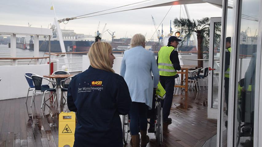 Unser Fahrgast Reimer arbeitete viele Jahre lang als Lkw-Fahrer und belieferte im Hafen Kreuzfahrtschiffe. Seine Familie wollte ihm den Wunsch erfüllen, den Hamburger Hafen noch einmal zu besuchen.