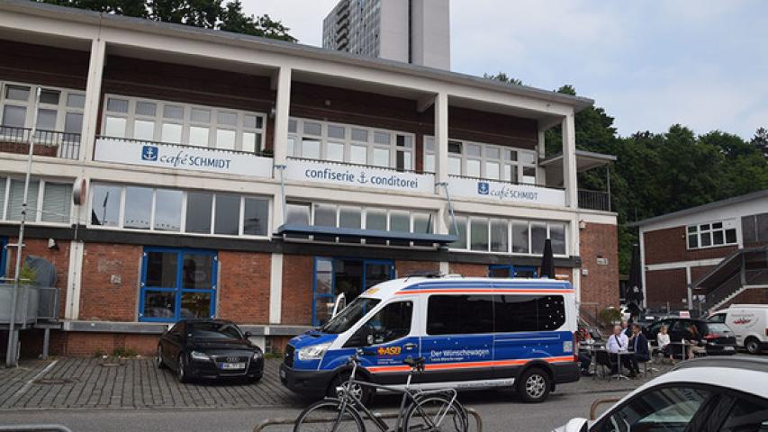 Mit Reimer und seiner Stieftochter an Bord machten wir uns auf den Weg zum Cruise Terminal Altona. Dort angekommen, warteten schon seine vier Schwestern und ein Freund auf den Wünschewagen.