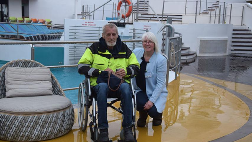 Alle gemeinsam durften wir, mit Sicherheitsschuhen und -westen ausgestattet, in den Sicherheitsbereich auf die Pier gehen. Dort wurde die AIDA Vita, die Reimer schon von vielen Arbeiten kannte, beladen. Alle Kollegen, die Reimer kannte, ob von der AIDA oder der Andreas Schmidt GmbH, kamen vorbei. Die Freude war groß, mit den Kollegen zu reden. Reimer sammelte alle seine Kräfte an diesem Tag zusammen, und wir hatten das Gefühl, dass er einfach dahin gehört. Auch sein Chef nahm sich die Zeit und besuchte unseren Fahrgast.