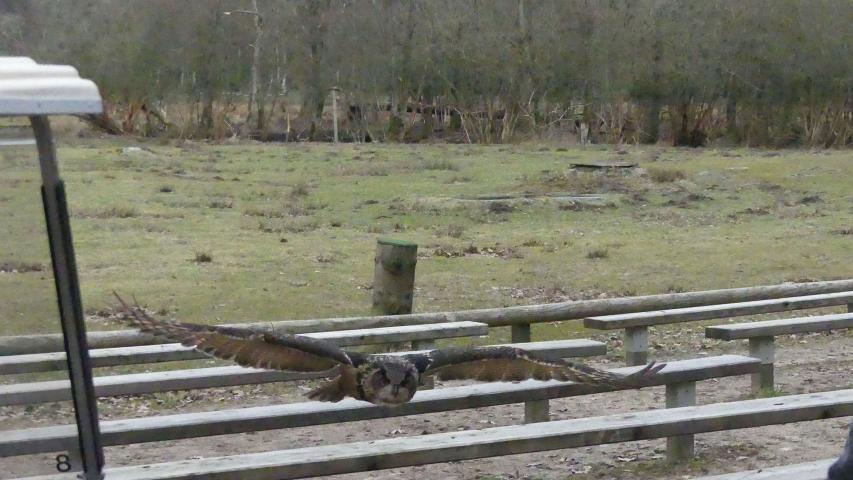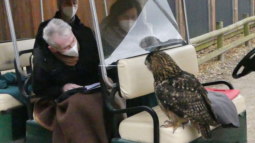 Unser nächster Halt ist die Flugschau. Zwar findet gerade keine offizielle Veranstaltung statt, aber auch hier haben die Kollegen eine Überraschung parat. Ein Uhu wartet auf dem Handschuh seiner Trainerin auf uns. Er soll einen großen Bogen fliegen und dann in unserem Wagen landen. Vielleicht hat er sich beim ersten Anflug verschätzt? Auf jeden Fall rauscht dieser große Vogel durch unseren Wagen und startet einen neuen Versuch. Beim Anblick der riesigen Schwingen und des starr ausgerichteten Blickes möchte man sich reflexartig irgendwo in Sicherheit bringen. Aber der Uhu ist schließlich ein Profi, und im nächsten Anlauf klappt es dann auch - und Fahrgast und Vogel sitzen sich Auge in Auge gegenüber. Ein ganz besonderer Moment, denn diese beeindruckenden Tiere sehen von Nahem mit ihren großen Krallen und dem kräftigen Schnabel noch Respekt einflößender aus.