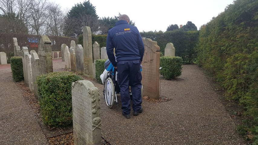 Weiter ging es in das Friesendorf Nebel. Auf die dortige St. Clemens Kirche von 1240 und den dazugehörigen Friedhof mit den „Sprechenden Grabsteinen“ aus dem 17. Jahrhundert freute sich unser Fahrgast ganz besonders. Ein Moment des Schweigens.