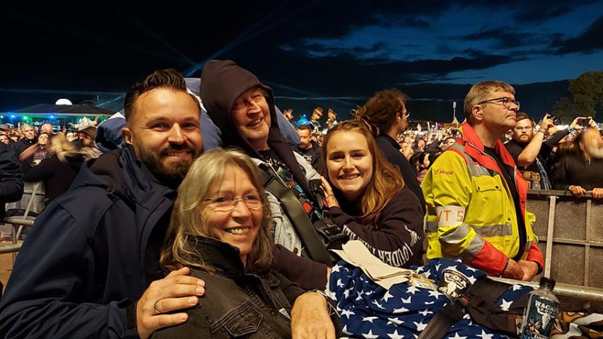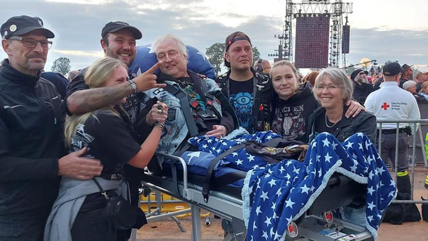 Am späten Freitagnachmittag trafen Nina und ich nun wirklich mit dem Wünschewagen bei Michael ein. Tränen der Begeisterung und Rührung flossen, so groß war die Freude, dass es jetzt doch wirklich losgehen sollte. Das beste Maiden Shirt wurde angezogen, darüber die Kutte mit den vielen Patches und Bändchen der vergangenen Wacken-Besuche. Gemütlich auf der Trage gebettet, und dann ging es los Richtung Holy Ground.